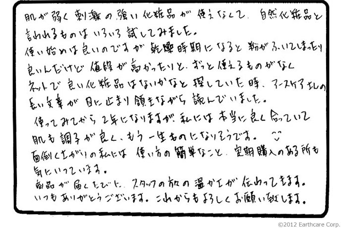 使い始めは良いのですが、乾燥時期になると粉がふいてしまったり、良いんだけど値段が高かったりと、ずっと使えるものがなく、ネットで良い化粧品はないかなと探していた時、アースケアさんの長い文章が目に留まり、頷きながら読んでいました。