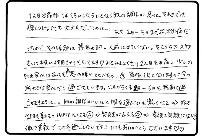 そこからアースケアさんに出会い使用させてもらってます♪みるみるよくなり2人目を出産。